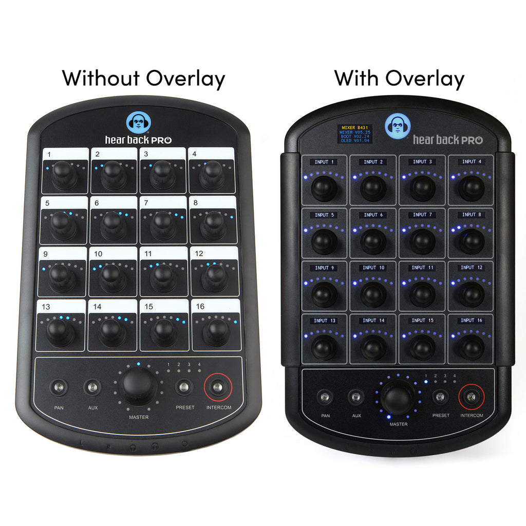 - Una superposición digital OLED de 16 canales para mezcladores Hear Back PRO