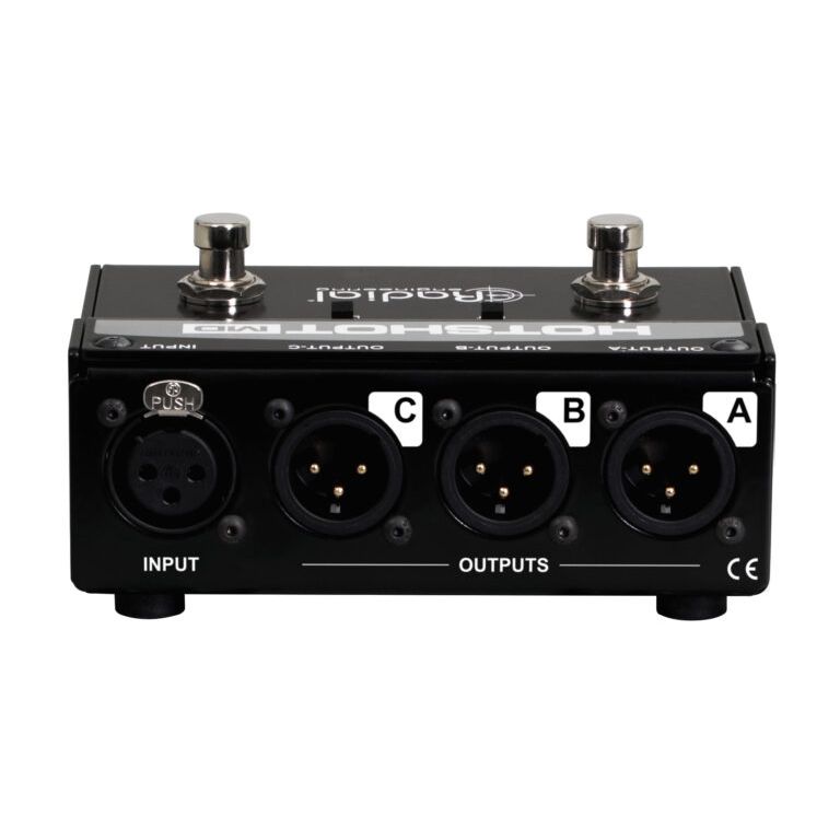 Una solución silenciosa para redirigir momentáneamente un micrófono dinámico en el escenario. El HotShot MD permite que la señal pase por la Salida A cuando no se pulsa ningún pedal, de modo que el micrófono vocal alimenta el sistema de PA con normalidad. Si se pulsan los pedales B o C a la vez, la Salida A se silencia y la señal se desvía a la Salida B o C, según el pedal que se pulse. Esto permite redirigir el micrófono al instante para hablar con los miembros de la banda o los técnicos, según sea necesario, sin que el público lo escuche. Ambos pedales también se pueden activar simultáneamente, para que puedas comunicarte con todos a la vez. En cuanto sueltes cualquiera de los dos, el micrófono vocal se redirige automáticamente al sistema de PA para que la actuación pueda continuar.